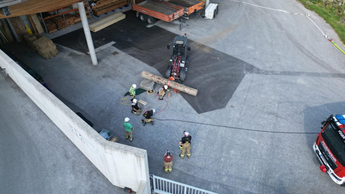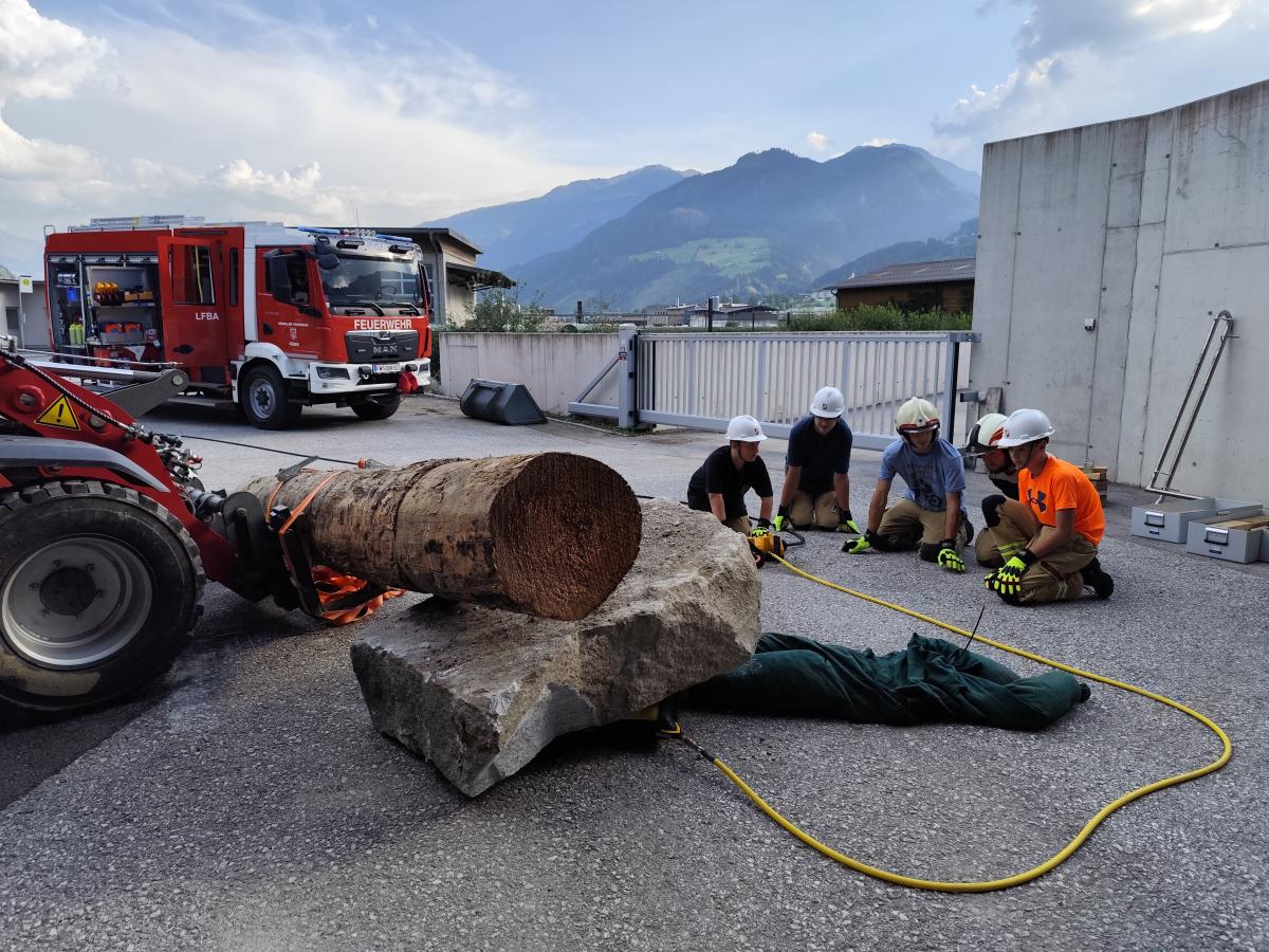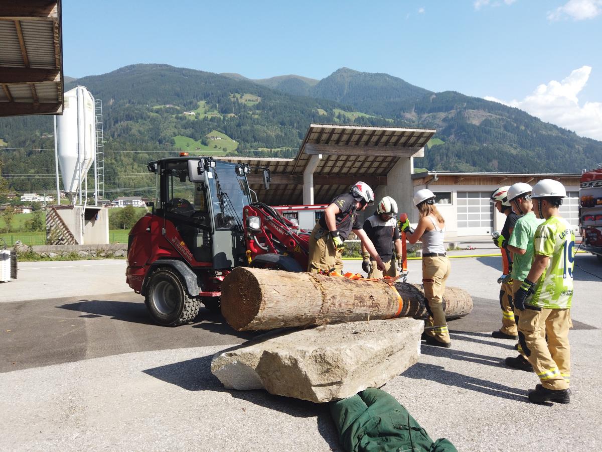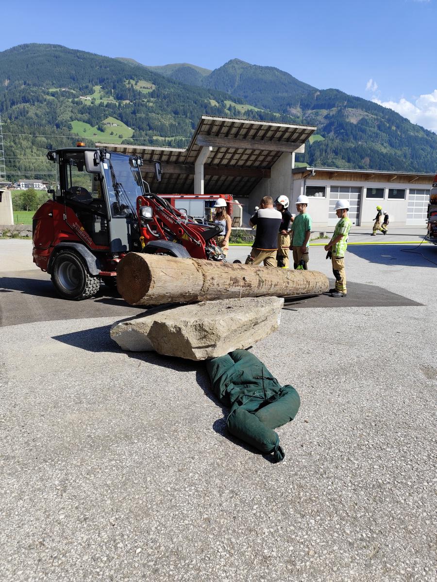 - LFBA (Löschfahrzeug mit Bergeausrüstung) – Arbeiten mit den Hebekissen bei einer eingeklemmten Person unter einem Hoftrac, einem Stein und einem Baumstamm.