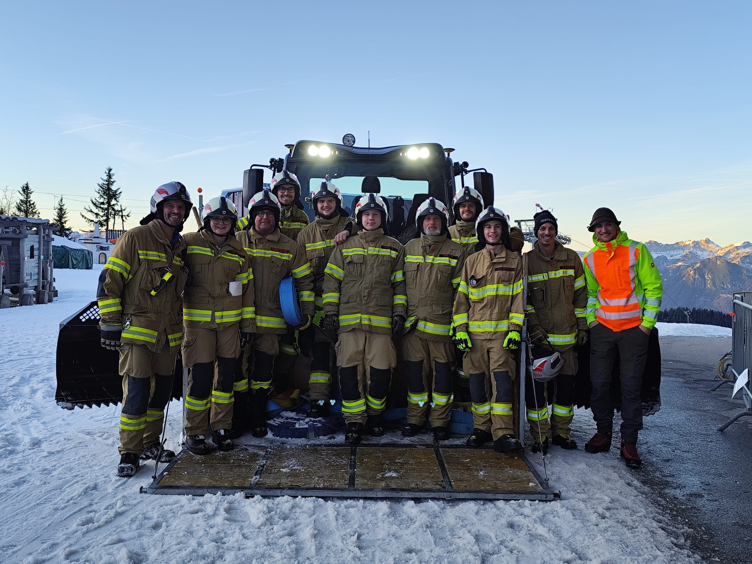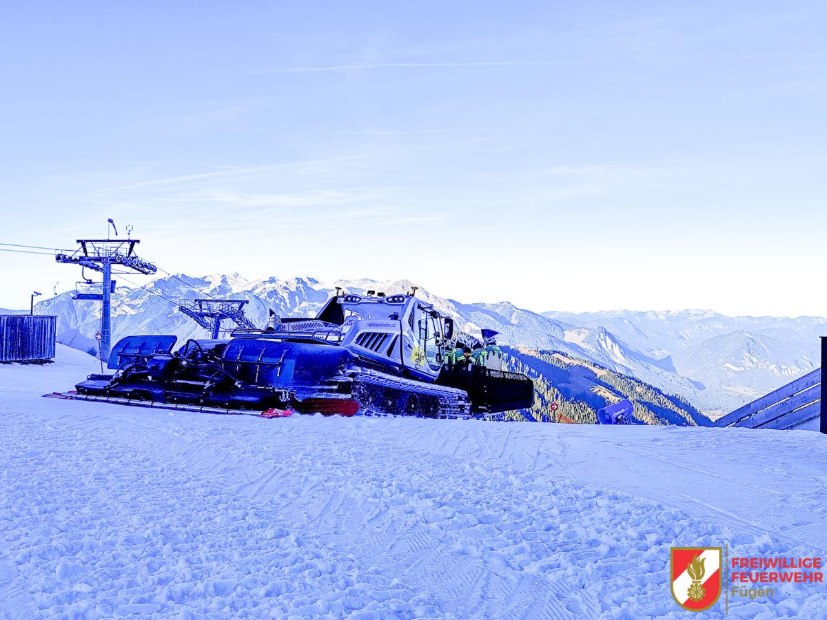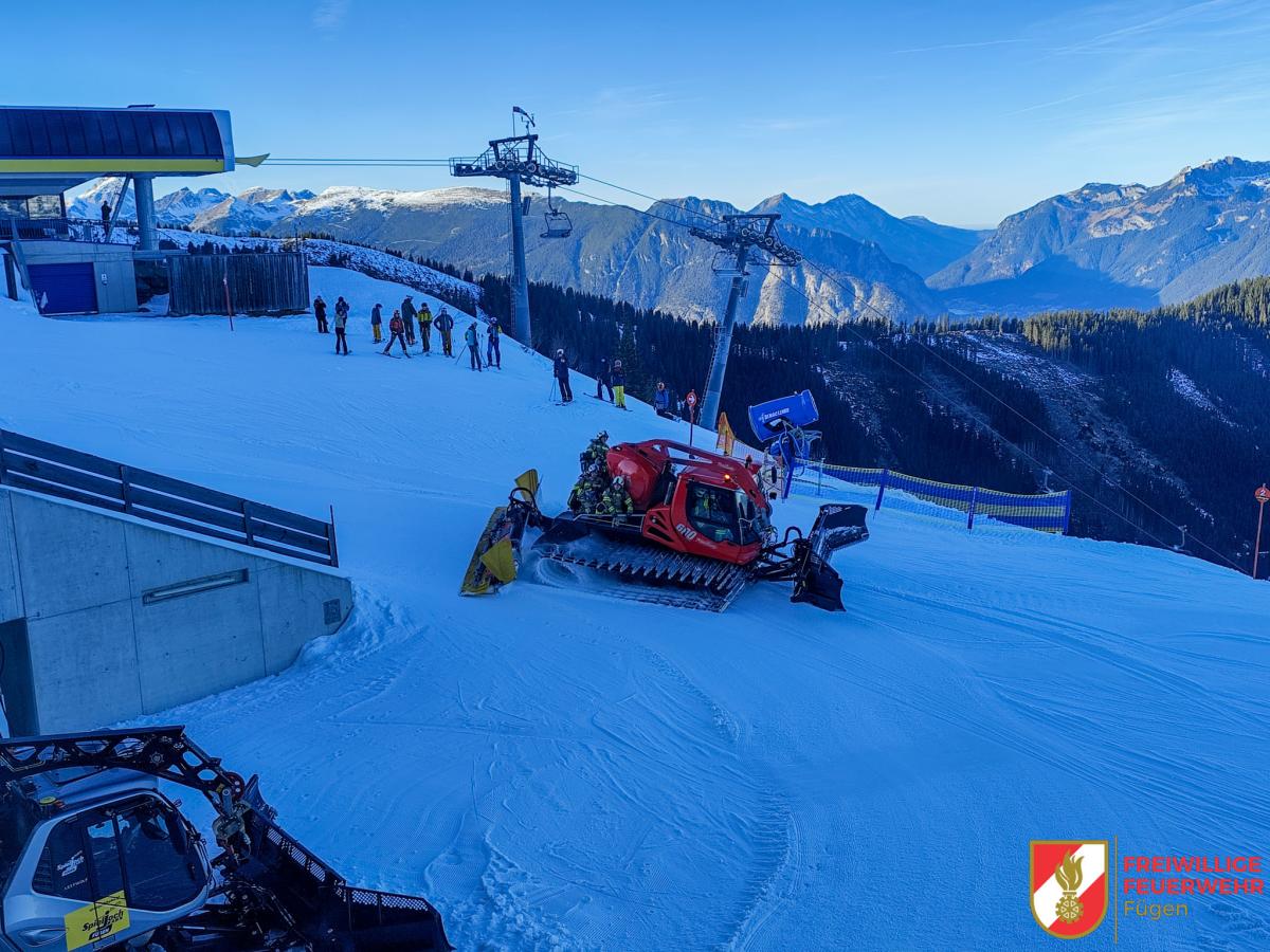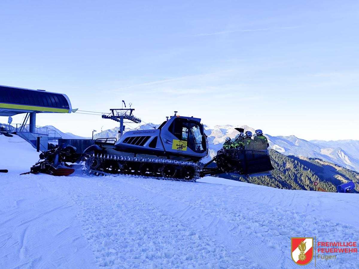 Die restliche Mannschaft nahm benötigte Werkzeuge auf und fuhr mit der Gondel von der Mittelstation zur Bergstation. Oben angekommen standen Pistengeräte bereit, um die Kameraden weiter in Richtung Brandherd zu transportieren.