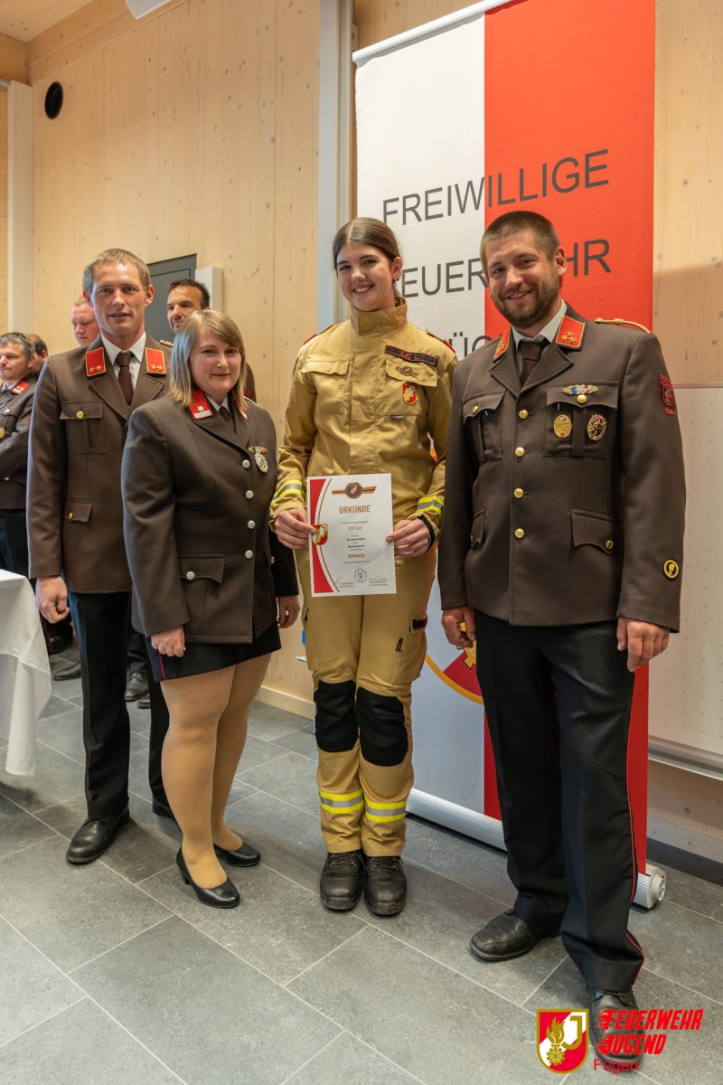 Im Anschluss ging es zurück ins Feuerwehrhaus. Im Beisein der Eltern, Geschwister, unserer Wimpelpatin Gabi sowie eines Großteils des Ausschusses wurden den Jugendlichen feierlich ihre wohlverdienten Abzeichen und Urkunden überreicht.